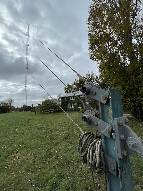 Ian also has a stacked rhombic antenna with 8 wavelengths on a leg giving a total of 1340m of radiating wire. The upper rhombic is at 40M and the lower rhombic is at 21M. The rhombic had a gain of 23dBi at a take off angle of 5 degrees on 20M and is directed at New York. The rhombic was modelled using EZNEC and it has 3dB more gain than the 5/5/5/5 yagis Both the yagis and the rhombic have a take off angle of 5 degrees which allows a comparison between the two antennas in the direction of New York. Ian sees see the 3 dB advantage which validates the accuracy of the NEC antenna modelling software.
