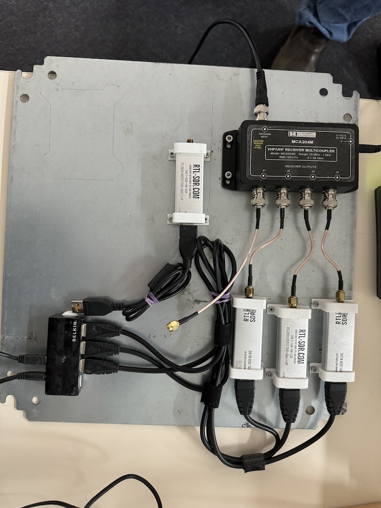 After explaining how trunk radio works and its many advantages over analog systems the presenters demonstrated SDR trunk operating with a bank of RTLSDRs fed from a vertical antenna via a receiver multicoupler.
