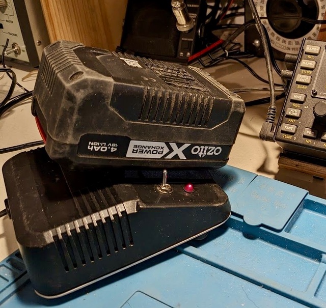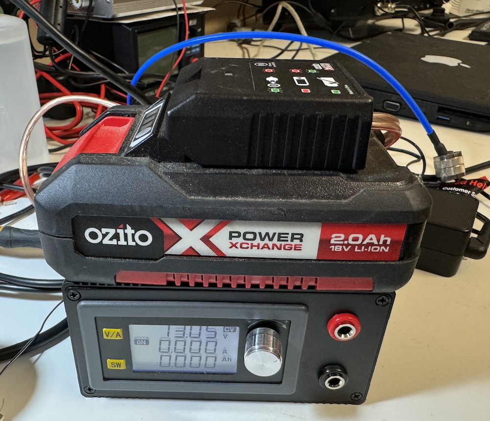 Inspired by David’s good work, Peter, VK3TPM, who has a number of Ozito battery packs (which produce about 20V when fully charged), took a spare single pack charger and connected wires to output the voltage from the cells. The charging circuitry doesn’t seem to mind this simple addition.