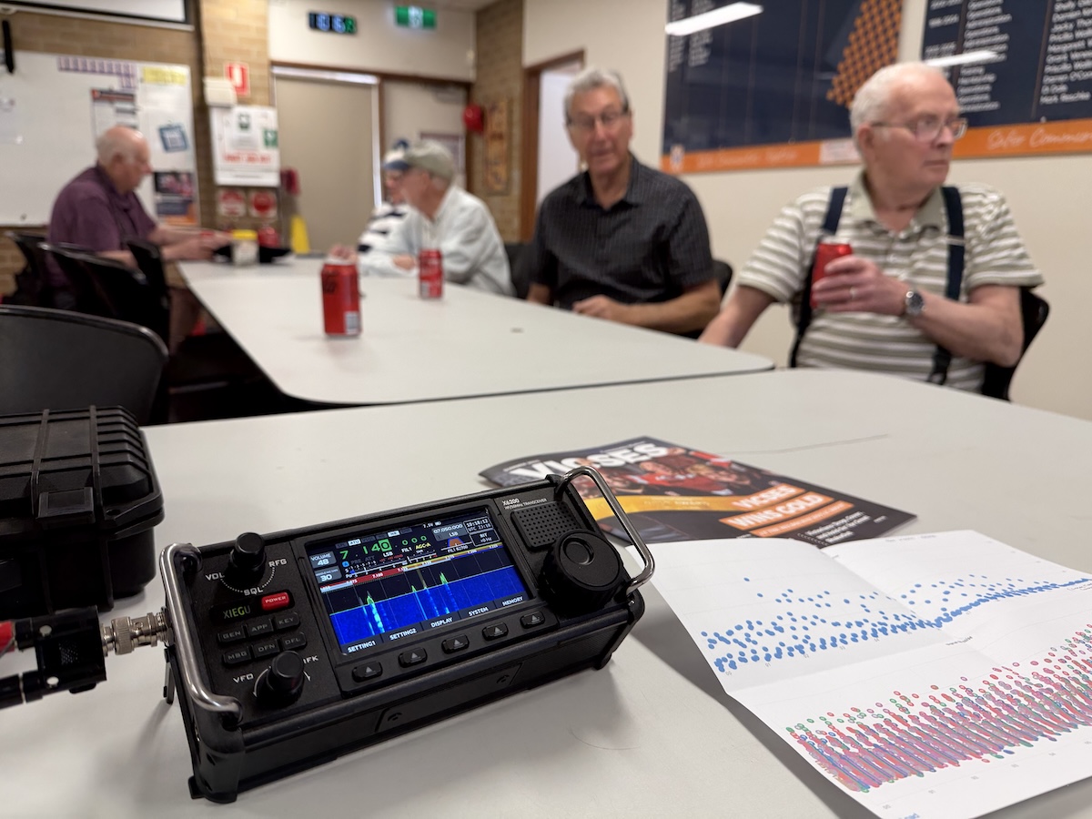 Peter, VK3TPM, brought a new (to him) Xiegu X6200 radio which seems like an excellent portable radio with built-in battery and antenna tuner. Despite just a short wire antenna it was able to pick up many stations on 40m.